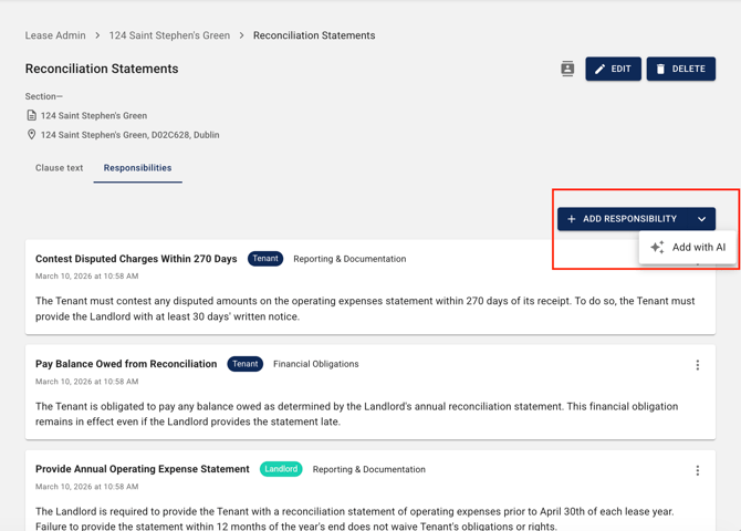 Yes. Any user with edit access to a lease can add a responsibility by hand using the Add Responsibility action on a clause. Manual records behave identically to AI-generated records in the Responsibilities Index.