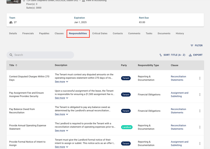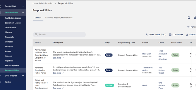 The Responsibilities Index is a portfolio-wide page that lists every accepted responsibility across every lease you have access to. Use it to answer portfolio-level questions in seconds instead of re-reading clauses.