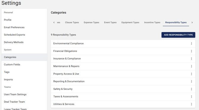 Open the responsibility from the lease Clauses tab or the Responsibilities Index and click Edit. Update any field and save. Changes are reflected everywhere the responsibility is displayed.