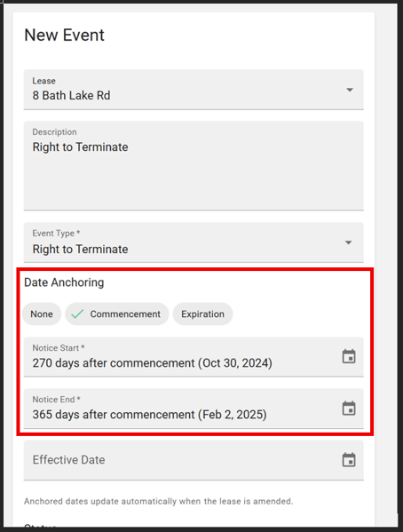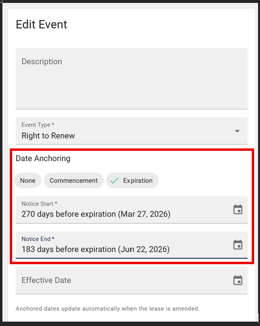 This optional field typically points to the renewal or expiration date of the lease term and is set to occur after the notice period ends. For anchored critical dates, it remains optional. Use this field when you are manually entering an effective date without using an anchor.