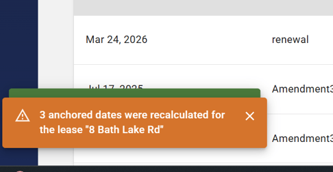 After a lease commencement or expiration date is updated, Occupier recalculates all anchored critical dates and displays an in-app notification.