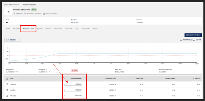 Select the lease and select the percentage rent tab, from here you can enter sales figures directly into the table provided below the reportable sales section.