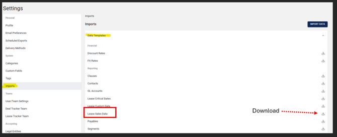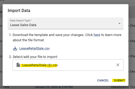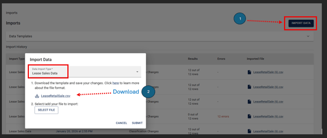 - Method B: Select the Import Data button, choose Lease Sales Data from the options, and download the template.