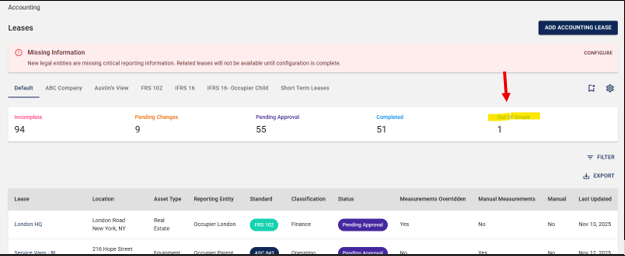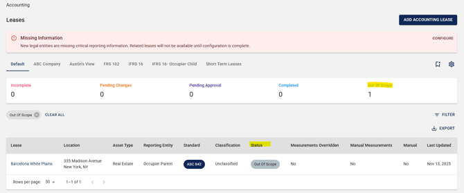 When a lease is reclassified as Out of Scope, its count will appear in the main Lease Index page for tracking purposes. However, these Out of Scope leases will no longer be visible in the primary lease list view nor included in any other reporting, allowing you to focus on leases that are currently subject to reporting and compliance requirements.