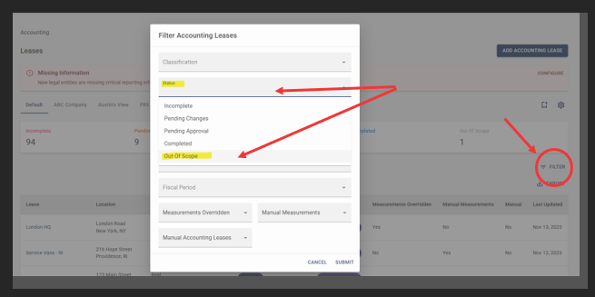 To locate and review leases that have been classified as Out of Scope, use the filter function within the Lease Index page.