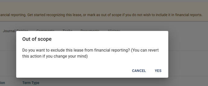 - A confirmation dialog will appear: "Do you want to exclude this lease from financial reporting? (You can revert this action if you change your mind)" Select Yes to confirm, or Cancel to return.