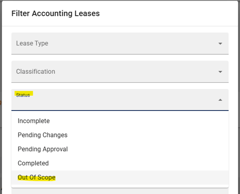To view Out of Scope or Archived leases, use the filter panel on the Accounting Lease Index: