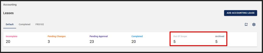 By default, the Accounting Lease Index displays only active leases. Out of Scope and Archived leases are excluded from the default view but can be accessed using filters. The lease count dashboard shows how many leases are in each of these statuses.